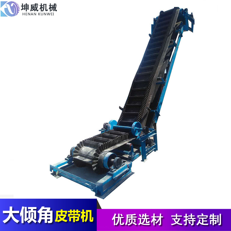 首先大傾角皮帶輸送機(jī)的輸送角度大,這個(gè)很明顯,普通型皮帶輸送機(jī)輸送角度只能是23°以下,需要大角度輸送的話就需要使用大傾角皮帶輸送機(jī)。而且大傾角皮帶輸送機(jī)的角度范圍在23-90°,比較靈活,可以根據(jù)現(xiàn)場情況布置不同角度的機(jī)器。